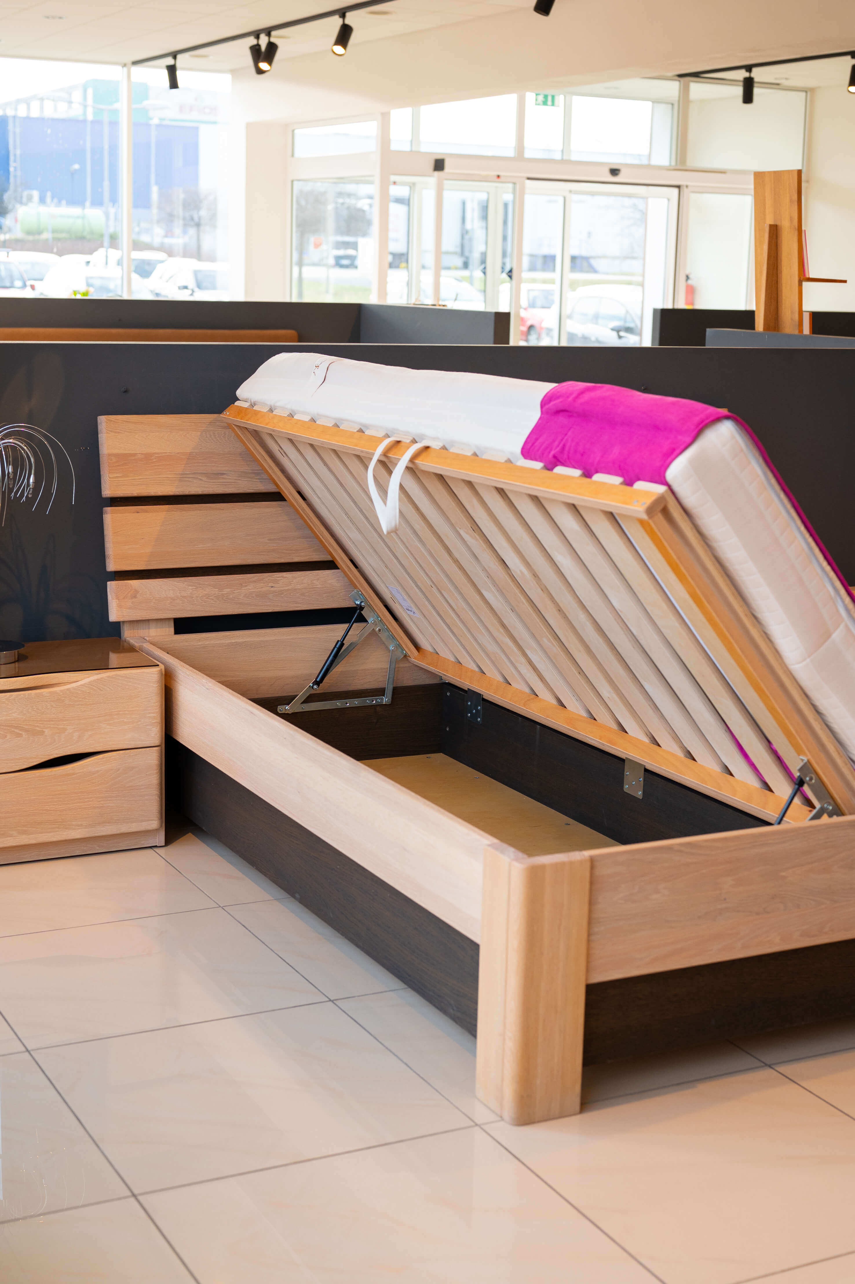 Do všech postelí JELÍNEK (vyjma postelí FLABO, AMANTA, MIA, LARA a ZIRBE) je možné vložit úložný prostor závěsný, který lze kombinovat se všemi typy polohovacích roštů a pevného roštu s překližkovými laťkami.