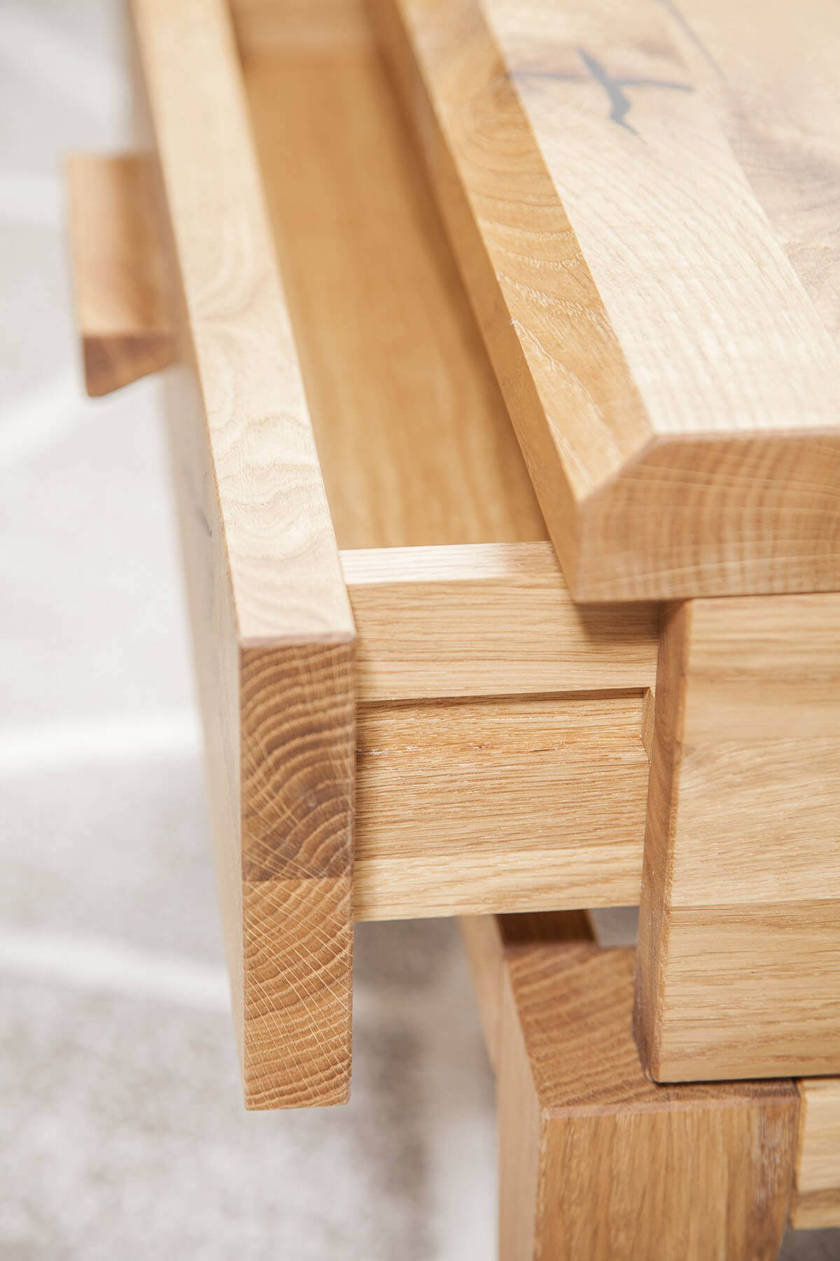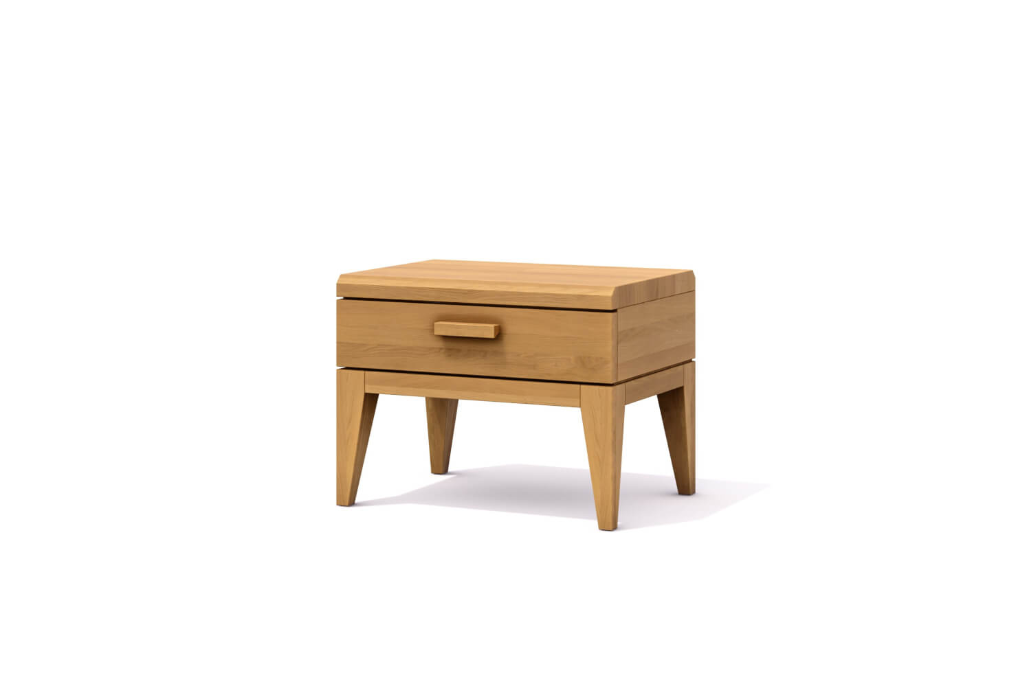 Nočný stolík MIA ponúka okrem odkladacej plochy aj jeden priestranný šuplík s drevenou úchytkou , ktorý Vám poslúži na odkladanie okuliarov, kníh alebo iných drobností. Vybrať si môžete z dvoch variantov, zásuvky s kovovými pojazdmi alebo bez kovu. Vyfrézovaná linka nočného stolíka nadväzuje na linku, ktorá zdobí bočnicu postele, preto je tento nočný stolík skvelým doplnkom k posteli MIA.